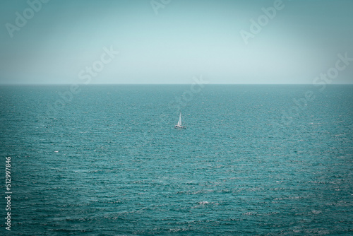 Obraz premium Sailing boat in a distance on open water. Mediterranean Sea with a blue sky