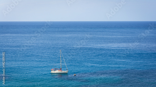 © tanaonte, Obraz premium Sailing boat on blue mediterranean water in Ibiza island