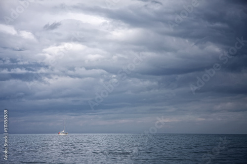 © stuart, Fototapeta premium Sailing boat on sea under storm clouds