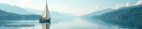 © Bawonwit, Fototapeta premium Sailing boat on the calm surface of a peaceful lake, nautical, marina