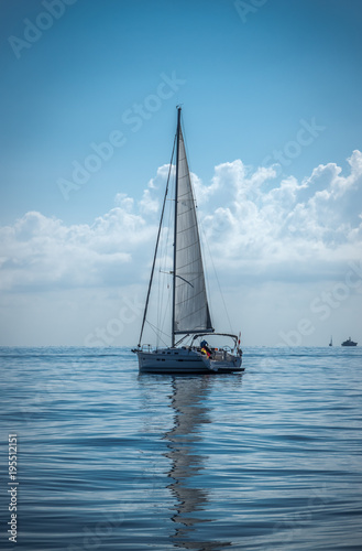© Pb, Naklejka premium Sailing boat on the sea sails reflect on a calm water summer day dark blue colors