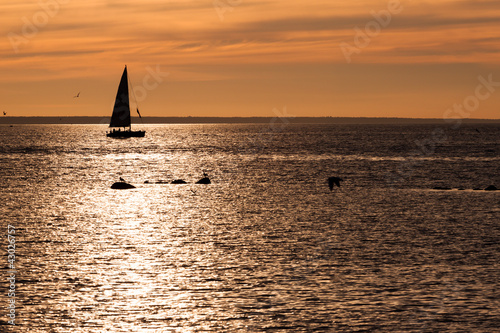 © VertigoBarrov, Fototapeta premium Sailing boat silhouette at sunset
