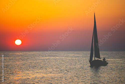 Fototapeta premium Sailing boat silhoutted against the orange sky