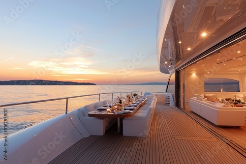 Fototapeta premium Sailing into Sophistication: Sunset Gourmet Dinner on Luxury Yacht Deck