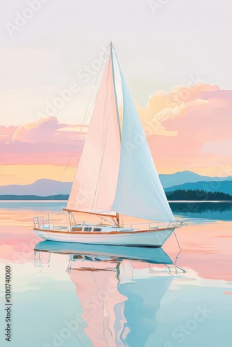 Naklejka premium Sailing into the sunset on a calm lake with pastel skies