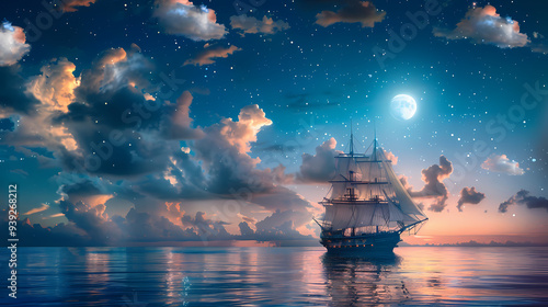 © ak159715, Obraz premium Sailing old ship in calm sea - Night sky with moon in the clouds