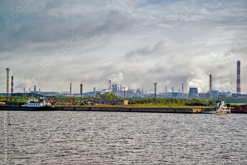© Сергей Зеленский, Naklejka premium Sailing on the northwest river along the territory of metallurgical plant