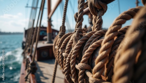 © Sergey, Obraz premium Sailing ropes in focus on historic ship deck