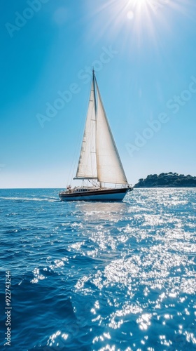 Fototapeta premium Sailing Serenity: A Majestic Sailing Yacht Glides Over Crystal Clear Waters with an Island and Azure Skies in the Background.