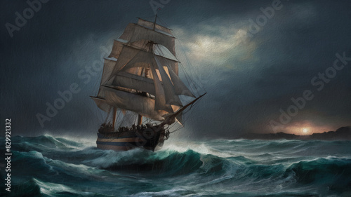 Obraz premium Sailing ship among the rough waves at sea, canvas painting, artwork