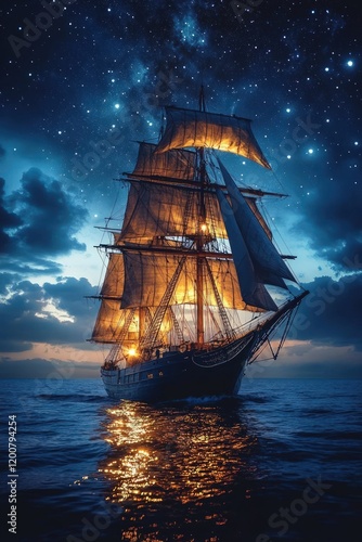 © Ali, Fototapeta premium Sailing ship at night, starry sky, ocean reflection.