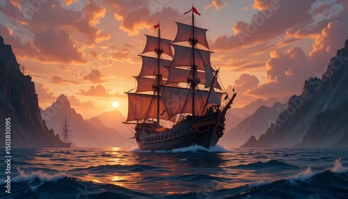 © Yani Aulia, Obraz premium Sailing Ship at Sunset