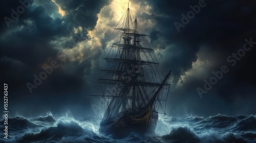 © Liu, Fototapeta premium Sailing Ship Battling Stormy Seas Under Dark Clouds