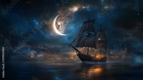 Fototapeta premium Sailing ship on dark water under a crescent moon with cloudy sky.