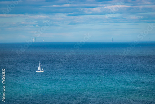 © helivideo, Fototapeta premium Sailing ship with unfurled white sails travels along the deep blue North Sea