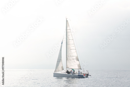 Fototapeta premium Sailing team adjusting sails on yacht during regatta on calm sea