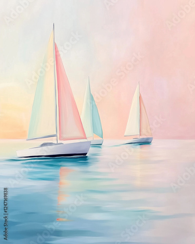 Fototapeta premium Sailing Vessels Glide Across Calm Waters During a Serene Sunset With Pastel...