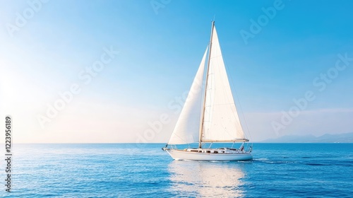 Naklejka premium Sailing yacht at sea, sunny day, calm waters, island in background; travel, vacation imagery