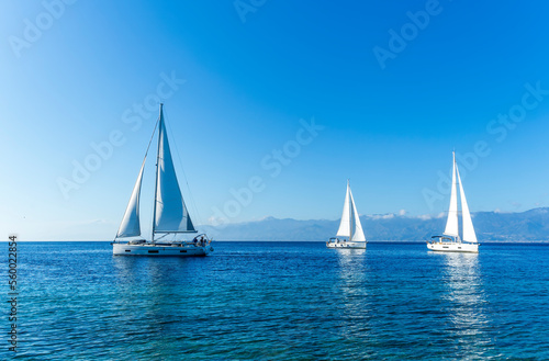 Fototapeta premium sailing yacht boats with white sails in blue sea , seascape of beautiful...