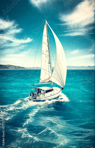 © ZoomTeam, Naklejka premium sailing yacht in calm sea. beautiful seascape. ai generative