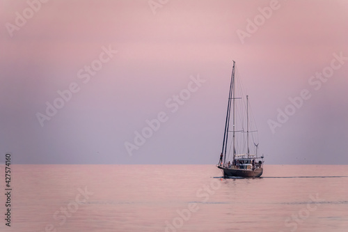 Fototapeta premium Sailing yacht in the blue sea during beautiful pink sunset.