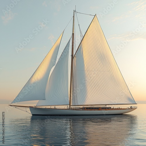 © Dece Std, Obraz premium Sailing yacht with white sails on still water, illuminated by the warm sunset