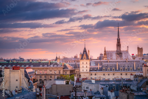 © Aide, Fototapeta premium Saint Chapelle and quarter latin roofs at golden sunrise Paris, France