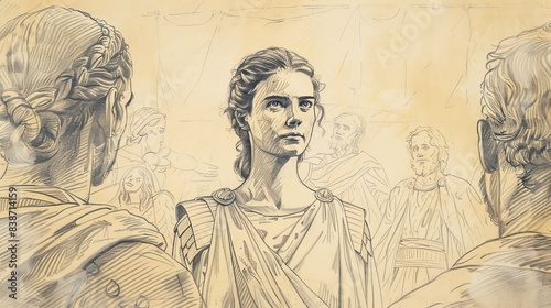 © T Studio, Fototapeta premium Saint Fausta Before Persecutors, Brave and Serene, Martyrdom, Biblical Illustration, Beige Background, Copyspace