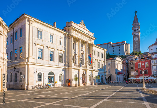 Fototapeta premium Saint George Church and Town Hall on Tartini Square in Piran Old Town,...
