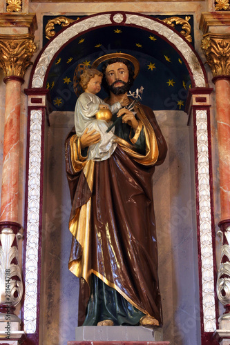 © zatletic, Fototapeta premium Saint Joseph holding baby Jesus, statue on the altar of Saint Joseph in the Church of Saint Barbara in Rude, Croatia