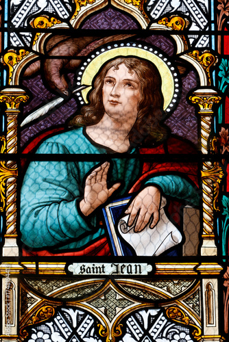 Fototapeta premium Saint Laurent church. Stained glass. John is traditionally depicted with an...