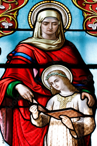 © Godong Photo, Fototapeta premium Saint Laurent church. Stained glass. The education of Mary by her mother St Anna. Tavernay. France.