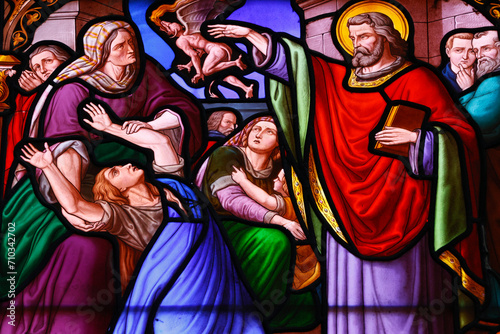 © Godong Photo, Fototapeta premium Saint Leonard church. Stained glass. Saint Bartholomew the Apostle. Arbois. France.