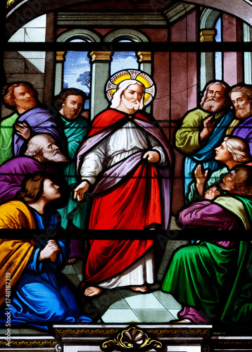 © Godong Photo, Obraz premium Saint Louis church. Stained glass. jesus and his apostles. La Roche sur Yon. France.