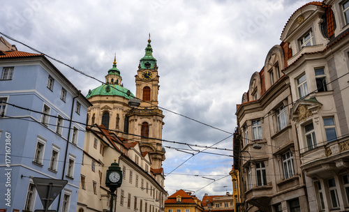 Fototapeta premium Saint Nicholas Church Tower Dominates Prague Lesser Town.