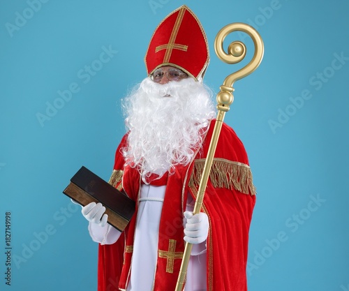 © New Africa, Fototapeta premium Saint Nicholas with book and crozier on blue background