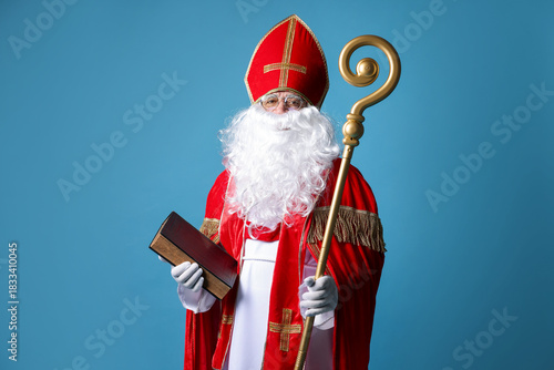 © New Africa, Obraz premium Saint Nicholas with book and crozier on blue background