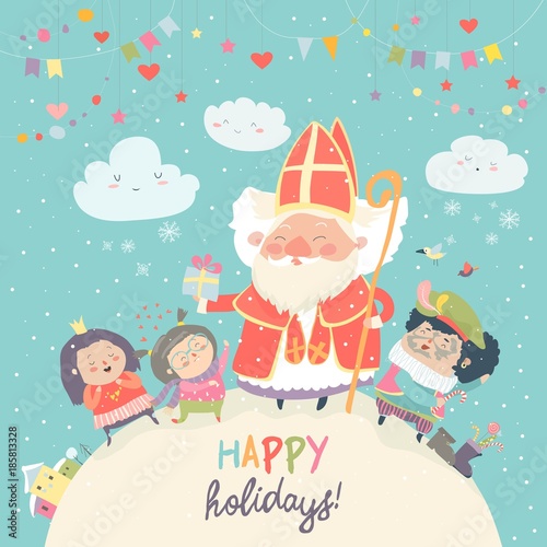 Fototapeta premium Saint Nicholas with Piet and happy kids