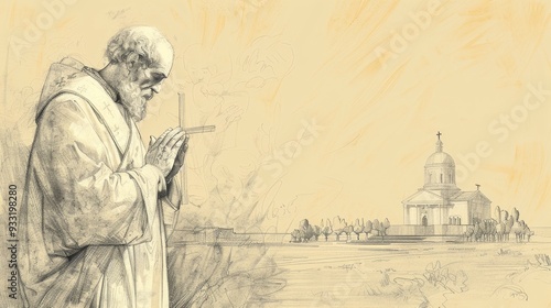 © T Studio, Fototapeta premium Saint Paulinus of Nola's deep faith in prayer, holding a cross, serene church, missionary dedication, beige background, Biblical Illustration, copyspace