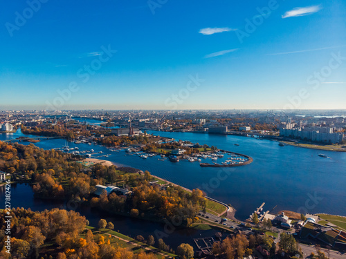 © Parilov, Fototapeta premium Saint-Petersburg. Gulf of Finland. Autumn urban landscape. Clear blue sky. Bridges. Residential area. Pleasure boats .