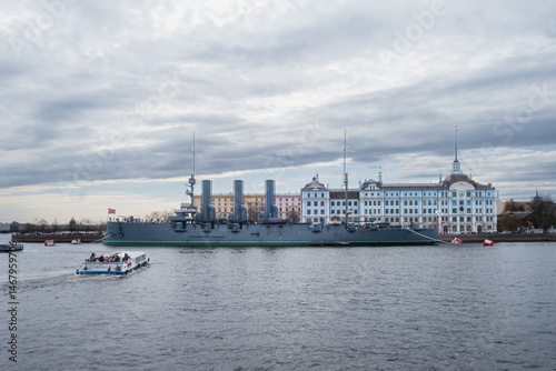 Naklejka premium Saint Petersburg, Russia - 02.05.25. Cruiser Aurora and Naval Academy by the River Neva in St. Petersburg