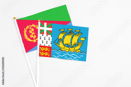 Obraz premium Saint Pierre And Miquelon and Eritrea stick flags on white background. High quality fabric, miniature national flag. Peaceful global concept.White floor for copy space.