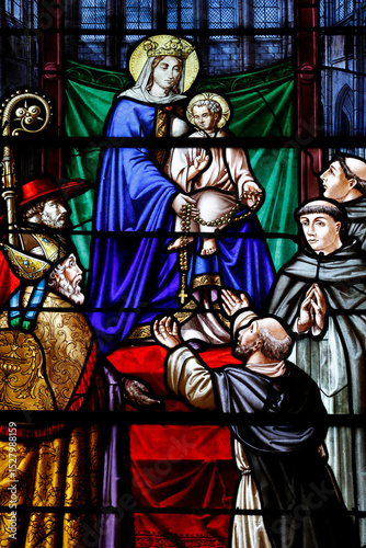 © Godong Photo, Fototapeta premium Saint Pierre church. Stained glass. Saint Dominic receiving the Rosary from the Virgin. Toucy. France.