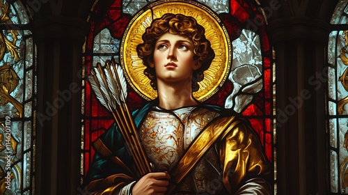 © CatholicPicture, Fototapeta premium Saint Sebastian in a luminous stained-glass scene, shown as a martyr with arrows and a calm expression, glowing crimson and gray patterns,