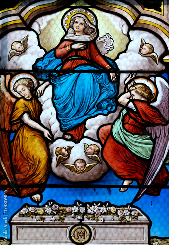 © Godong Photo, Obraz premium Saint Seine church. Stained glass. The Assumption of Mary into Heaven. Corbigny. France.