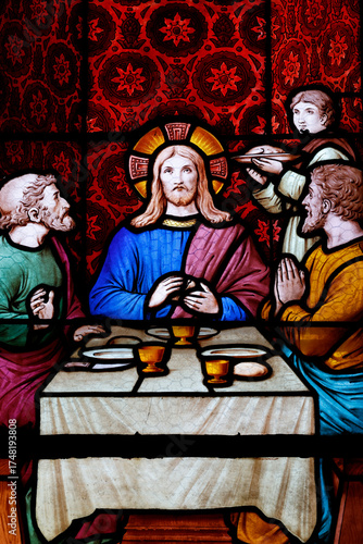 © Godong Photo, Fototapeta premium Saint Seine church. Stained glass. The Supper at Emmaus was one of the occasions when Jesus revealed himself to his followers after his Crucifixion and Resurrection. Corbigny. France.