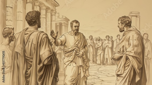 © T Studio, Fototapeta premium Saint Vitus's bravery and martyrdom, facing Roman persecutors, calm expression, dramatic Roman background, beige background, Biblical Illustration, copyspace