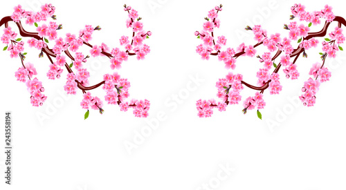Fototapeta premium Sakura. Branches with purple flowers. Cherry blossoms is located on both sides. Inscription. Isolated on white background. Illustration