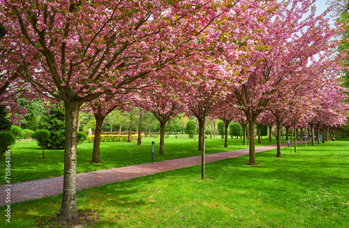 Fototapeta premium Sakura Cherry blossoming alley. Wonderful scenic park with rows of blooming cherry sakura trees and green lawn in spring.