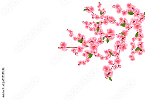 Naklejka premium Sakura. Cherry branches with delicate pink flowers, leaves and buds. Isolated on white background illustration.